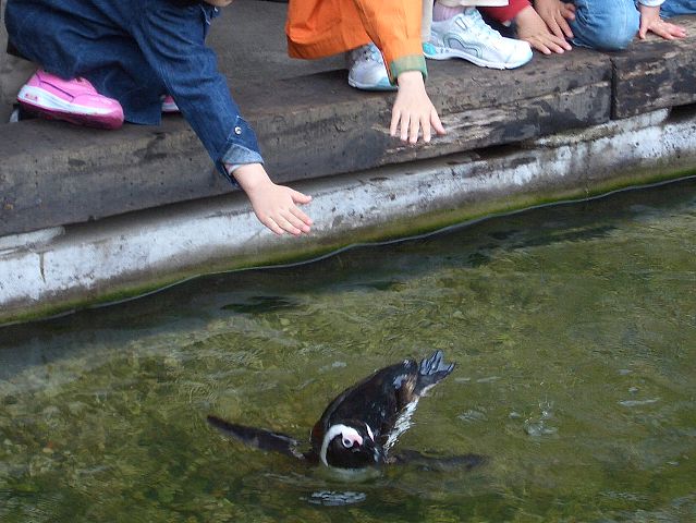 池の縁で、近付いてくるペンギンに触ろうとする子供達。